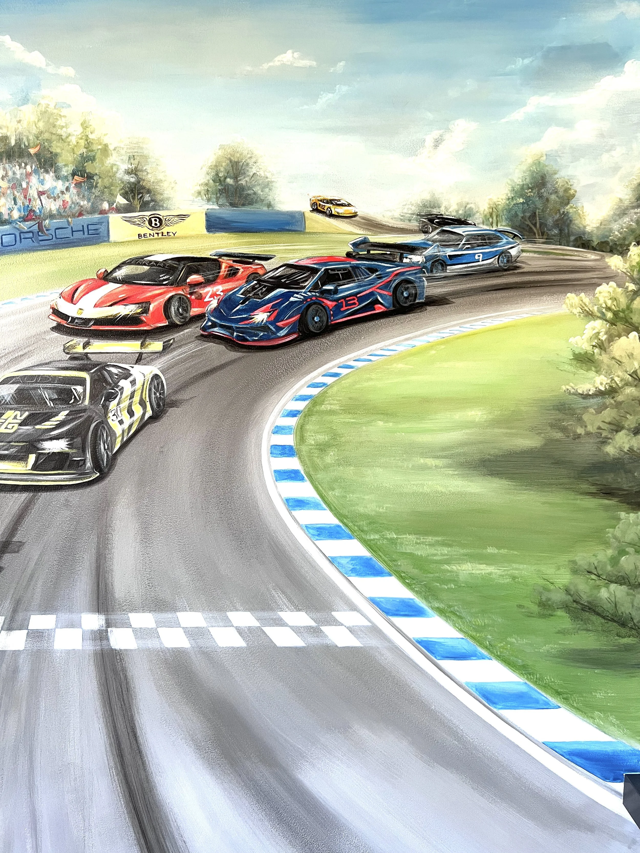 Perfect mural for a race car fan! My client picked out the type and color of cars he wanted! I implemented his bed into the design, in which they loved! Such a fun room! Enjoy!